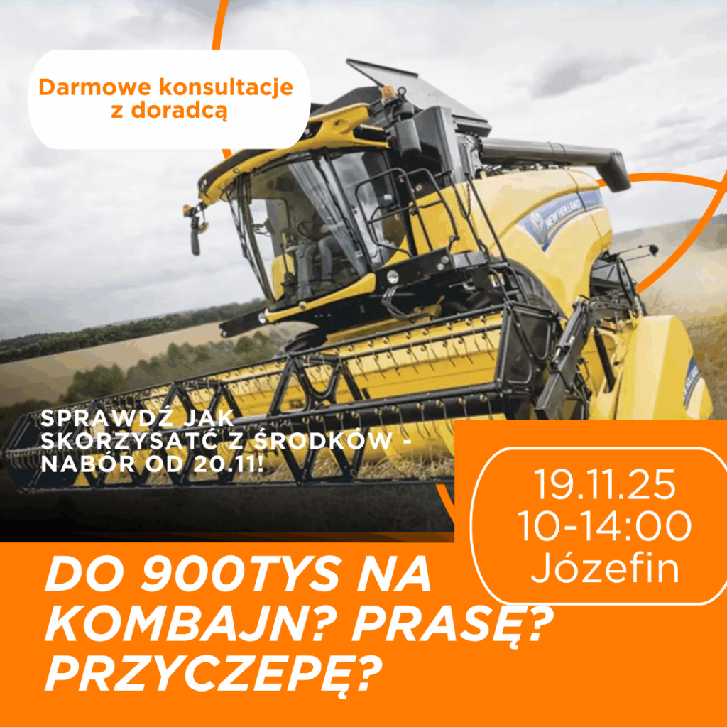 Już 19 listopada 2025 r. zapraszamy rolników na specjalne spotkanie informacyjne, podczas którego omówimy krok po kroku, jak uzyskać dotację do 900 tys. zł na zakup nowego kombajnu w ramach programu ARiMR „Inwestycje w gospodarstwach rolnych zwiększające konkurencyjność” (obszar D).